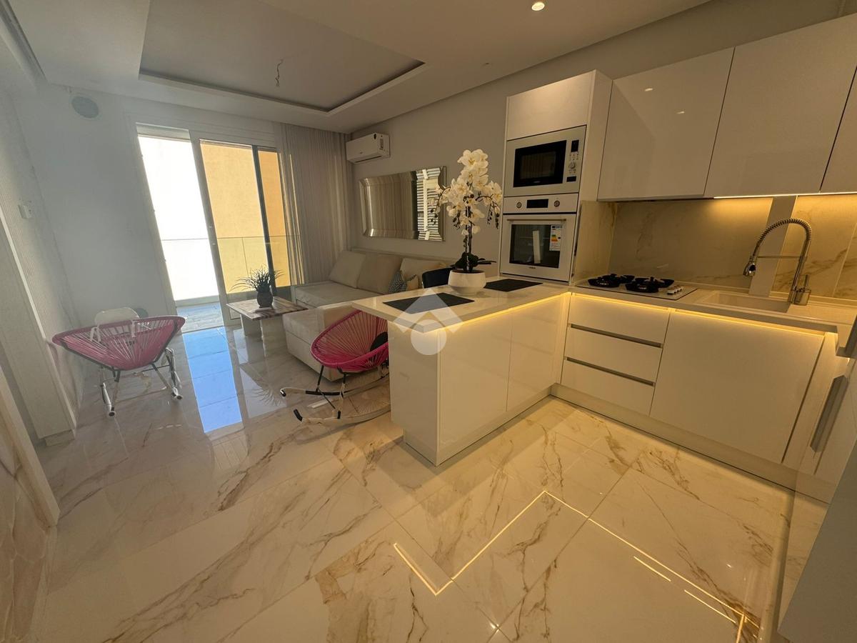 L’espace jour se compose d’un salon lumineux avec balcon, offrant une vue imprenable sur la mer, ainsi qu’une cuisine à l’américaine entièrement équipée, pensée pour allier design et praticité.
